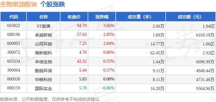 证券之星消息,12月25日生物柴油板块较上一交易日上涨1.35%,ST嘉澳领涨。当日上证指数报收于3959.62,上涨0.47%。深证成指报收于13531.41,上涨0.33%。生物柴油板块个股涨跌见下表: