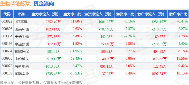 从资金流向上来看,当日生物柴油板块主力资金净流出598.29万元,游资资金净流出910.73万元,散户资金净流入1509.02万元。生物柴油板块个股资金流向见下表: