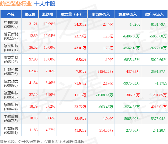 个股表现方面,航空装备行业当日领涨股为广联航空(300900),该股当日报收31.21,上涨19.99%,成交量54.31万,主力资金净流入2.44亿元。博云新材(002297)以上涨10.04%紧随其后,该股当日成交量23.79万,主力资金净流入1.23亿元。除此之外,航发科技(600391)、派克新材(605123)、佳驰科技(688708)均进入当日牛股之列。具体个股列表见下表: