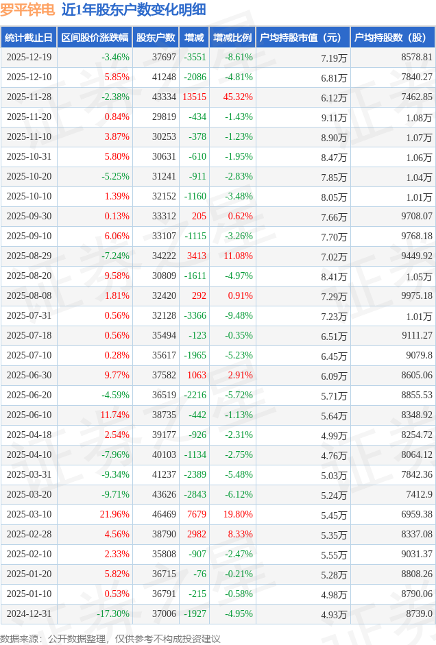 从股价来看,2025年12月10日至2025年12月19日,罗平锌电区间跌幅为3.46%,在此期间股东户数减少3551.0户,减幅为8.61%。