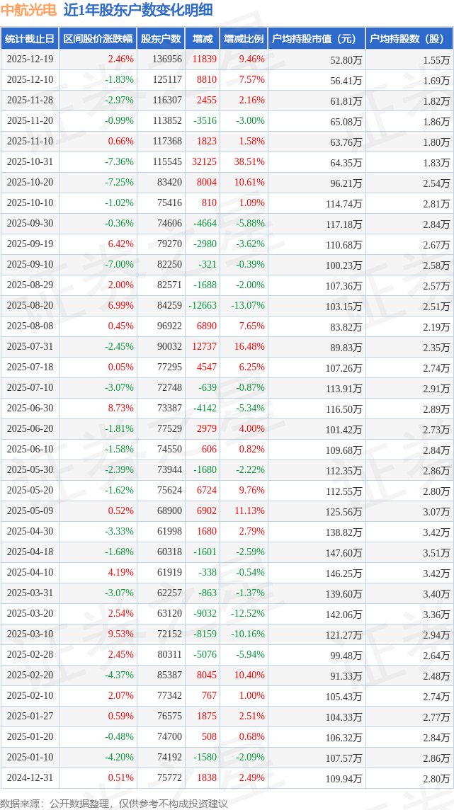 从股价来看,2025年12月10日至2025年12月19日,中航光电区间涨幅为2.46%,在此期间股东户数增加1.18万户,增幅为9.46%。