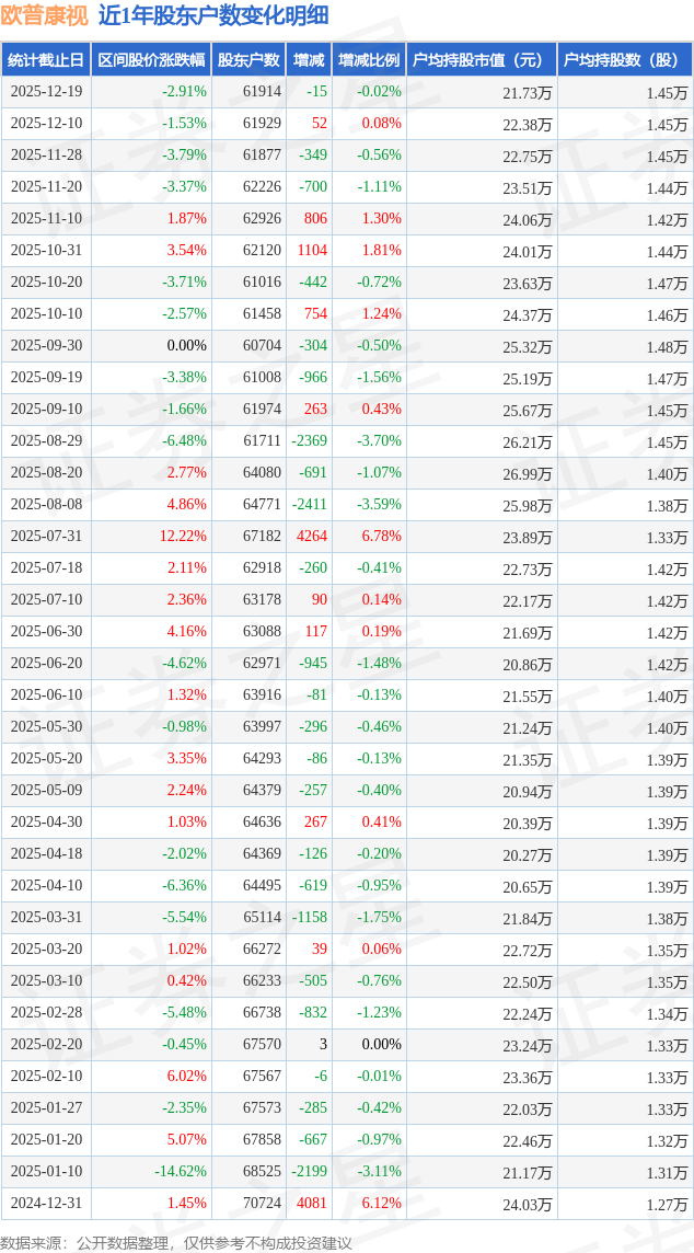 从股价来看,2025年12月10日至2025年12月19日,欧普康视区间跌幅为2.91%,在此期间股东户数减少15.0户,减幅为0.02%。