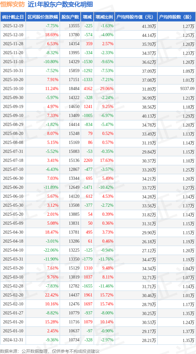 从股价来看,2025年12月10日至2025年12月19日,恒辉安防区间跌幅为7.75%,在此期间股东户数减少225.0户,减幅为1.63%。