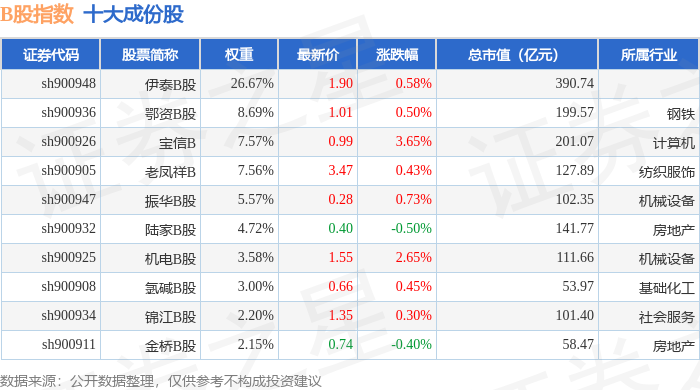 证券之星消息,12月25日,B股指数(000003)报收于252.53点,涨0.71%,成交1.06亿元,换手率0.15%。当日该指数成份股中,上涨的有21家,宝信B以3.65%的涨幅领涨,下跌的有15家,锦在线B以0.99%的跌幅领跌。