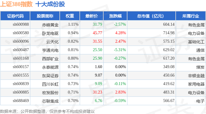 上证380(000009)指数十大成份股详情如下: