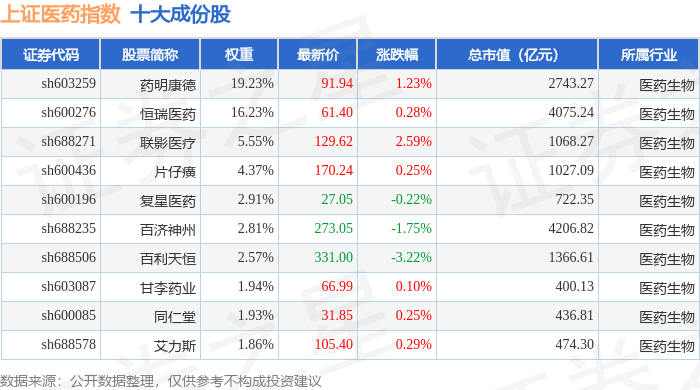 证券之星消息,12月25日,上证医药(000037)指数报收于6467.74点,涨0.39%,成交121.61亿元,换手率0.56%。当日该指数成份股中,上涨的有34家,昭衍新药以4.24%的涨幅领涨,下跌的有13家,百利天恒以3.22%的跌幅领跌。