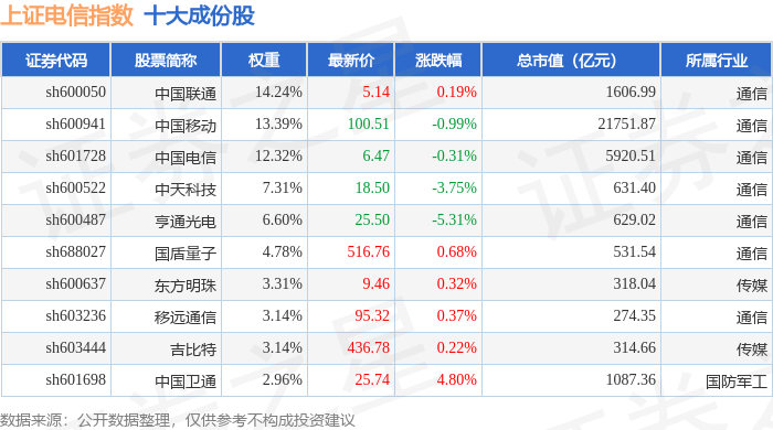 证券之星消息,12月25日,上证电信(000040)指数报收于3940.34点,跌0.36%,成交328.66亿元,换手率0.83%。当日该指数成份股中,上涨的有22家,信科移动以15.49%的涨幅领涨,下跌的有11家,亨通光电以5.31%的跌幅领跌。