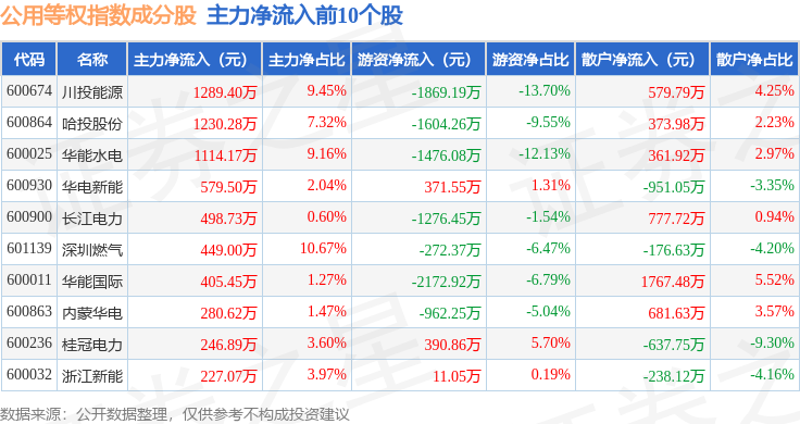 资金流向方面,公用等权(000079)指数成份股当日主力资金净流出合计4.14亿元,游资资金净流入合计1.52亿元,散户资金净流入合计2.62亿元。成份股资金流向详情见下表: