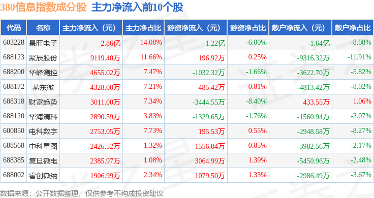 资金流向方面,380信息(000111)指数成份股当日主力资金净流出合计9.93亿元,游资资金净流入合计6.41亿元,散户资金净流入合计3.53亿元。成份股资金流向详情见下表: