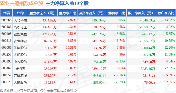资金流向方面,农业主题(000122)指数成份股当日主力资金净流出合计9153.85万元,游资资金净流入合计5718.76万元,散户资金净流入合计3435.1万元。成份股资金流向详情见下表: