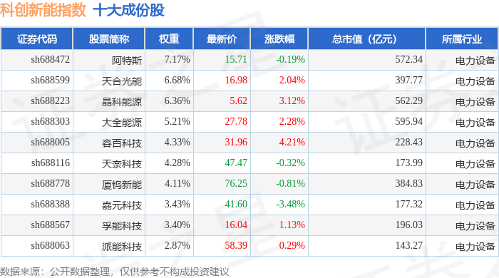 科创新能(000692)指数十大成份股详情如下: