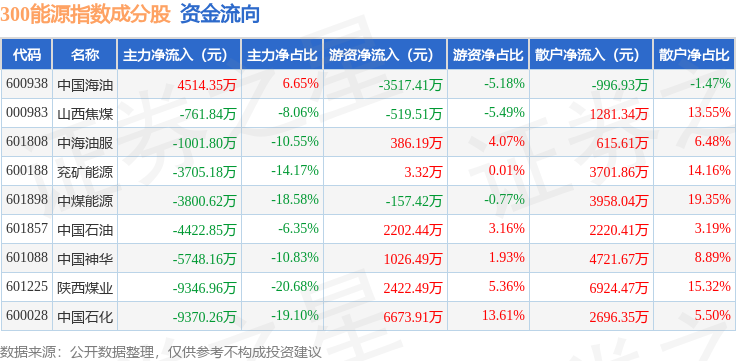 资金流向方面,300能源(000908)指数成份股当日主力资金净流出合计3.36亿元,游资资金净流入合计8520.51万元,散户资金净流入合计2.51亿元。成份股资金流向详情见下表: