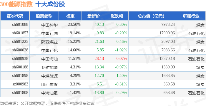 证券之星消息,12月25日,300能源(000908)指数报收于2300.06点,跌0.45%,成交35.04亿元,换手率0.09%。当日该指数成份股中,上涨的有1家,中国海油以0.07%的涨幅领涨,下跌的有8家,中煤能源以1.4%的跌幅领跌。