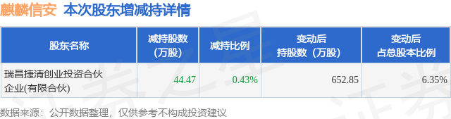 证券之星消息,12月25日麒麟信安发布公告《麒麟信安:关于持股5%以上股东权益变动触及1%刻度的提示性公告》,其股东瑞昌捷清创业投资合伙企业(有限合伙)于2025年11月25日至2025年12月25日间合计减持44.47万股,占公司目前总股本的0.4324%,变动期间该股股价下跌4.79%,截止12月25日收盘报41.18元。