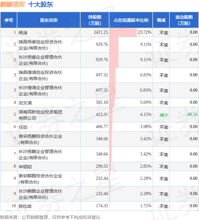 根据麒麟信安2025年三季报公布的十大股东详情如下: