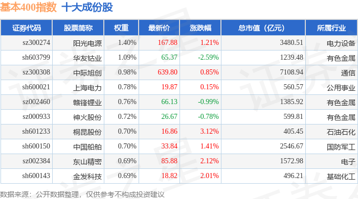 证券之星消息,12月25日,基本400(000966)指数报收于8853.58点,涨0.34%,成交2644.67亿元,换手率1.29%。当日该指数成份股中,上涨的有241家,首开股份以10.04%的涨幅领涨,下跌的有128家,亨通光电以5.31%的跌幅领跌。