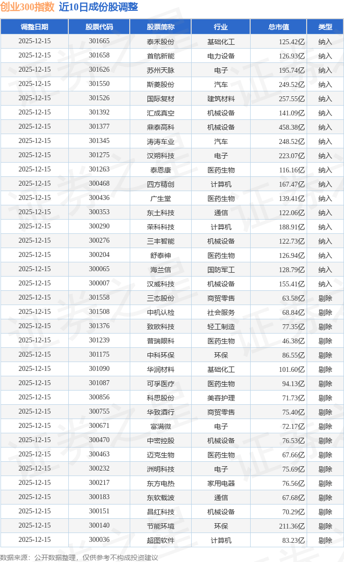 近10日内创业300(399012)指数成份股做了调整,新纳入了18只股票,剔除了18只股票。