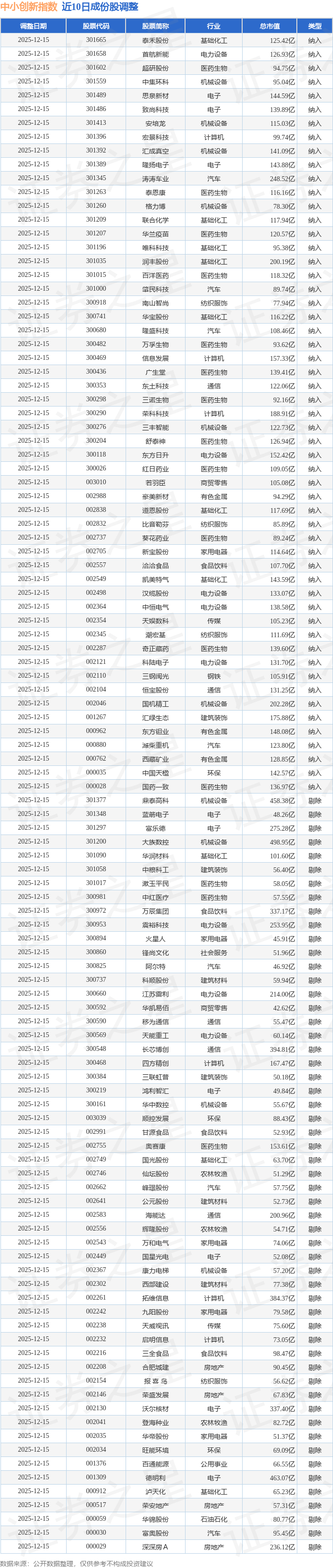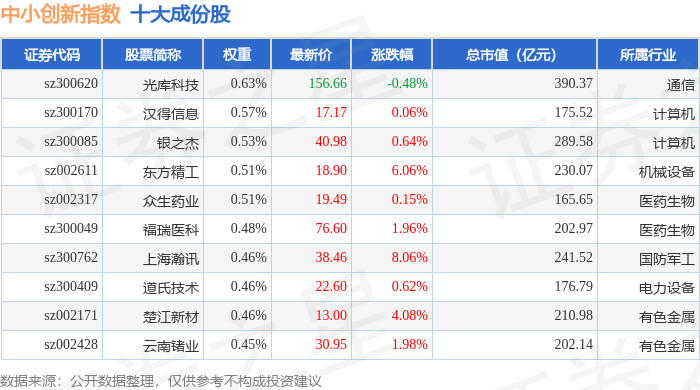 中小创新(399015)指数十大成份股详情如下: