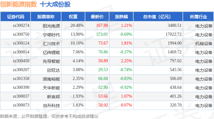 创新能源(399266)指数十大成份股详情如下: