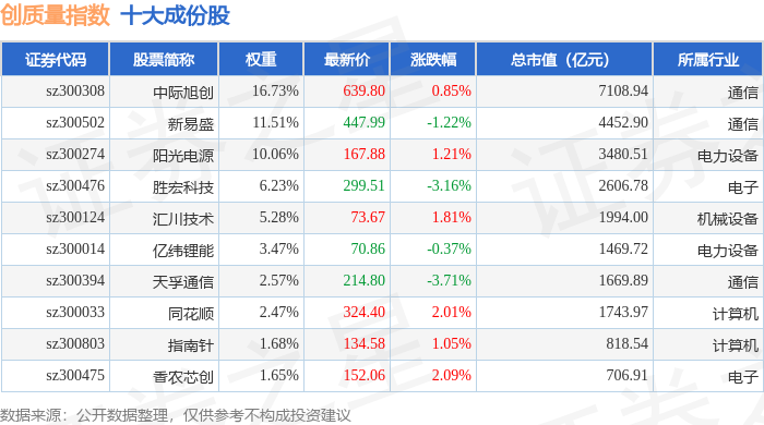 证券之星消息,12月25日,创质量(399269)指数报收于8282.74点,涨0.21%,成交1320.56亿元,换手率3.17%。当日该指数成份股中,上涨的有69家,泰胜风能以10.97%的涨幅领涨,下跌的有29家,长芯博创以4.39%的跌幅领跌。