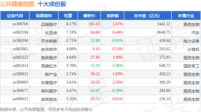 公共健康(399277)指数十大成份股详情如下: