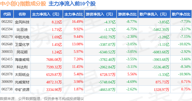 资金流向方面,中小创Q(399294)指数成份股当日主力资金净流入合计2.82亿元,游资资金净流出合计9.81亿元,散户资金净流入合计6.99亿元。成份股资金流向详情见下表: