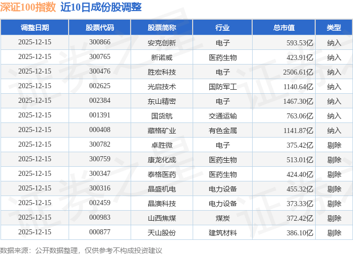 近10日内深证100(399330)指数成份股做了调整,新纳入了7只股票,剔除了7只股票。