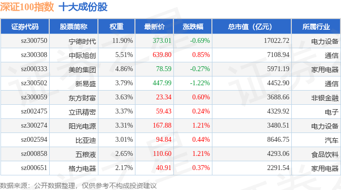 证券之星消息,12月25日,深证100(399330)指数报收于5865.84点,涨0.06%,成交1793.34亿元,换手率0.9%。当日该指数成份股中,上涨的有63家,三花智控以5.5%的涨幅领涨,下跌的有35家,天孚通信以3.71%的跌幅领跌。
