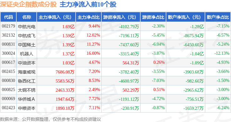 资金流向方面,深证央企(399335)指数成份股当日主力资金净流出合计9.98亿元,游资资金净流出合计8915.32万元,散户资金净流入合计10.87亿元。成份股资金流向详情见下表: