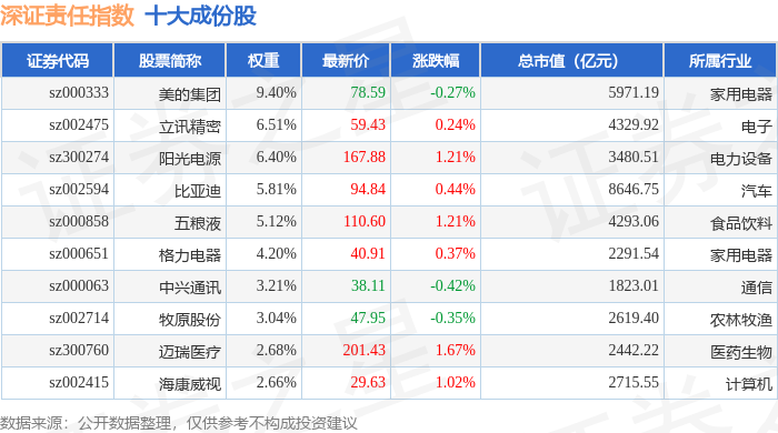 深证责任(399341)指数十大成份股详情如下: