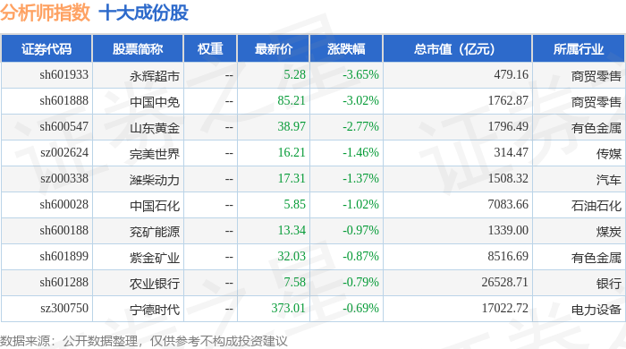 证券之星消息,12月25日,分析师指数(399354)报收于8389.73点,涨0.2%,成交1765.72亿元,换手率0.29%。当日该指数成份股中,上涨的有64家,海大集团以4.13%的涨幅领涨,下跌的有30家,永辉超市以3.65%的跌幅领跌。