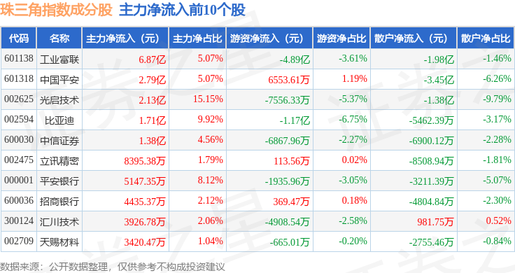资金流向方面,珠三角(399356)指数成份股当日主力资金净流出合计20.52亿元,游资资金净流入合计2.83亿元,散户资金净流入合计17.69亿元。成份股资金流向详情见下表: