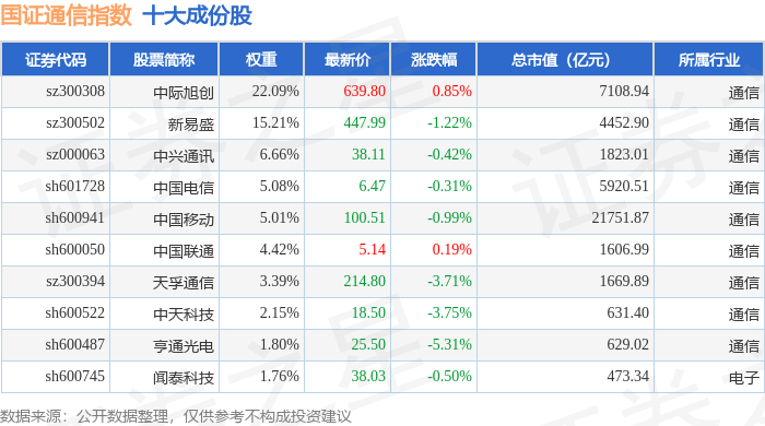 国证通信(399389)指数十大成份股详情如下:
