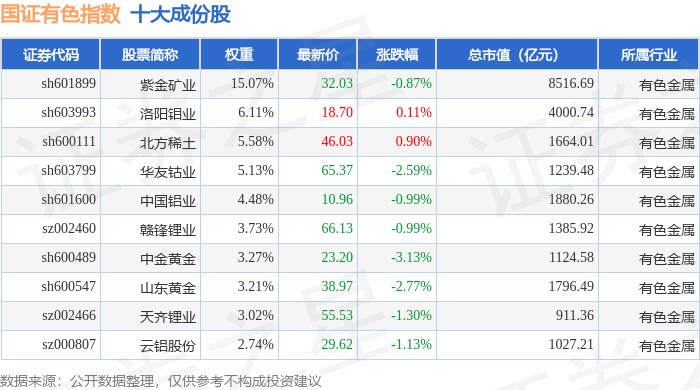 证券之星消息,12月25日,国证有色(399395)指数报收于9275.51点,跌0.98%,成交606.11亿元,换手率1.59%。当日该指数成份股中,上涨的有14家,中科三环以3.68%的涨幅领涨,下跌的有36家,白银有色以4.75%的跌幅领跌。