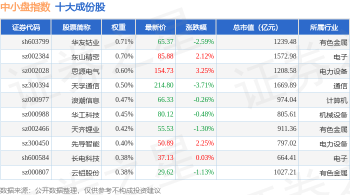 证券之星消息,12月25日,中小盘(399401)指数报收于4781.49点,涨0.54%,成交5536.82亿元,换手率1.53%。当日该指数成份股中,上涨的有505家,复旦微电以16.21%的涨幅领涨,下跌的有258家,芯原股份以6.82%的跌幅领跌。