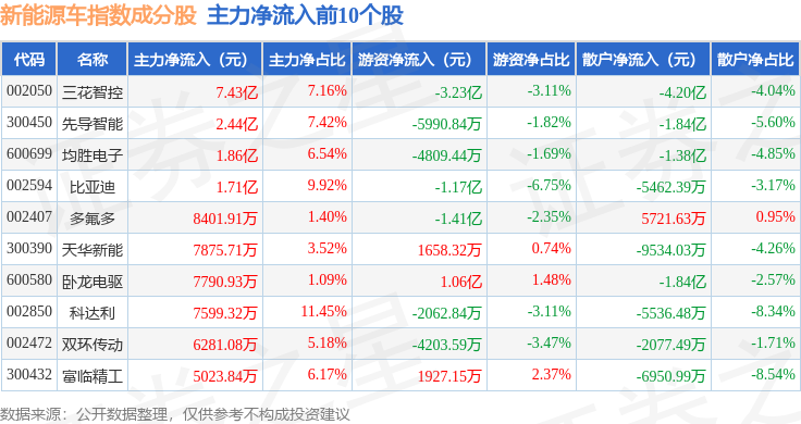 资金流向方面,新能源车(399417)指数成份股当日主力资金净流出合计16.55亿元,游资资金净流出合计4143.79万元,散户资金净流入合计16.72亿元。成份股资金流向详情见下表: