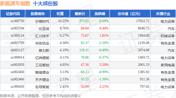 新能源车(399417)指数十大成份股详情如下: