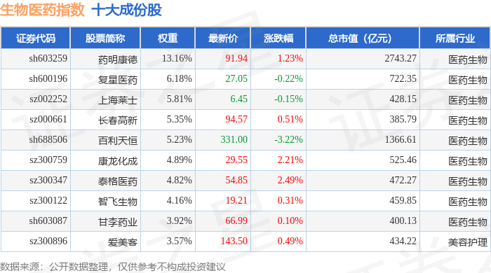 生物医药(399441)指数十大成份股详情如下: