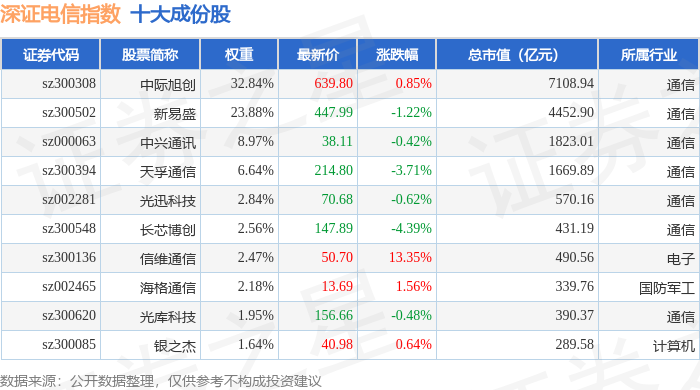 证券之星消息,12月25日,深证电信(399621)指数报收于12828.13点,涨0.12%,成交740.2亿元,换手率5.3%。当日该指数成份股中,上涨的有9家,信维通信以13.35%的涨幅领涨,下跌的有10家,长芯博创以4.39%的跌幅领跌。