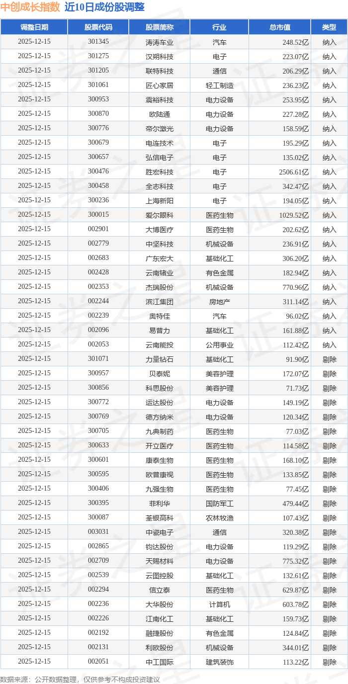 近10日内中创成长(399626)指数成份股做了调整,新纳入了22只股票,剔除了22只股票。