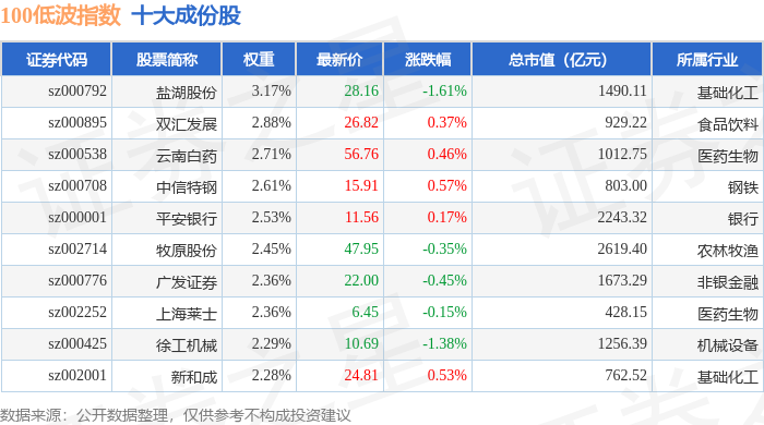 100低波(399645)指数十大成份股详情如下: