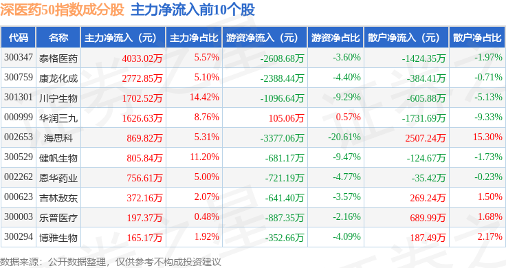 资金流向方面,深医药50(399647)指数成份股当日主力资金净流出合计5.65亿元,游资资金净流出合计5497.35万元,散户资金净流入合计6.2亿元。成份股资金流向详情见下表: