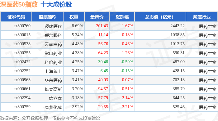 证券之星消息,12月25日,深医药50(399647)指数报收于8043.37点,涨0.71%,成交123.11亿元,换手率1.01%。当日该指数成份股中,上涨的有39家,乐普医疗以2.58%的涨幅领涨,下跌的有10家,美年健康以1.11%的跌幅领跌。