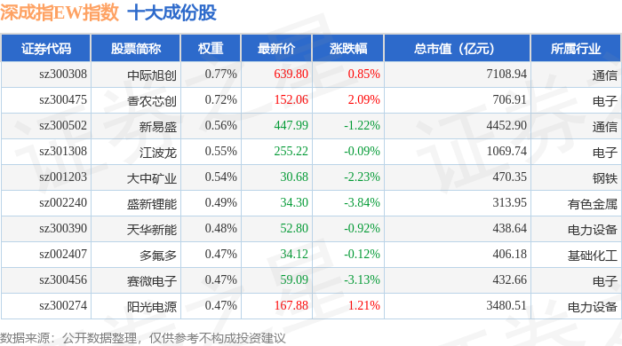 证券之星消息,12月25日,深成指EW(399659)指数报收于4712.95点,涨0.59%,成交4952.94亿元,换手率1.55%。当日该指数成份股中,上涨的有306家,信维通信以13.35%的涨幅领涨,下跌的有173家,海峡股份以5.23%的跌幅领跌。