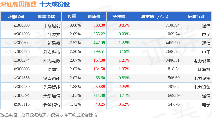 证券之星消息,12月25日,深证高贝(399662)指数报收于2446.33点,涨0.34%,成交2239.06亿元,换手率2.41%。当日该指数成份股中,上涨的有55家,长盈精密以8.52%的涨幅领涨,下跌的有43家,菲利华以3.71%的跌幅领跌。