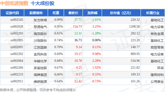 证券之星消息,12月25日,中创低波(399665)指数报收于2359.09点,涨0.68%,成交954.91亿元,换手率1.17%。当日该指数成份股中,上涨的有129家,金风科技以9.98%的涨幅领涨,下跌的有57家,大金重工以3.66%的跌幅领跌。