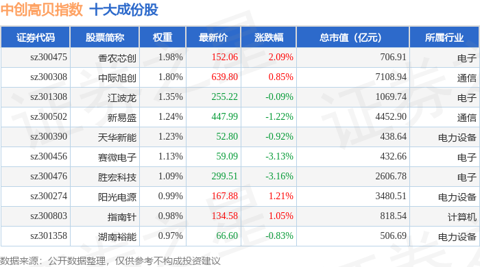 证券之星消息,12月25日,中创高贝(399666)指数报收于2069.57点,涨1.0%,成交3161.47亿元,换手率3.72%。当日该指数成份股中,上涨的有131家,信维通信以13.35%的涨幅领涨,下跌的有65家,欧陆通以4.99%的跌幅领跌。