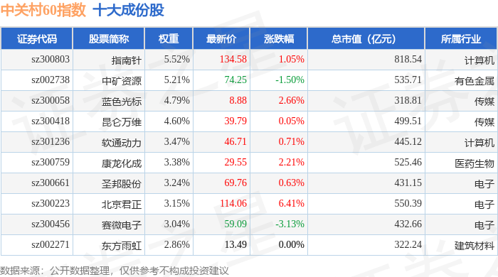 证券之星消息,12月25日,中关村60(399697)指数报收于3695.09点,涨1.08%,成交480.27亿元,换手率3.42%。当日该指数成份股中,上涨的有50家,北京君正以6.41%的涨幅领涨,下跌的有8家,赛微电子以3.13%的跌幅领跌。