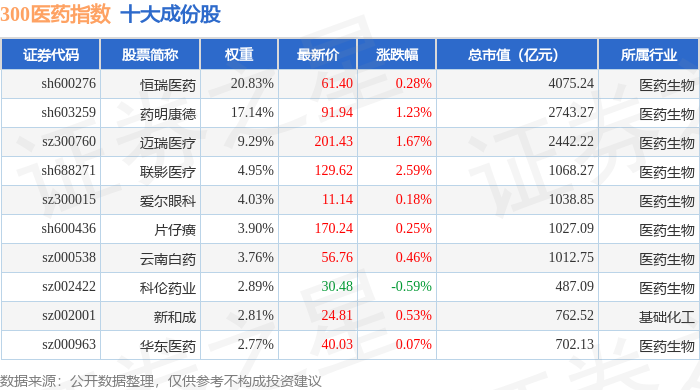 300医药(399913)指数十大成份股详情如下: