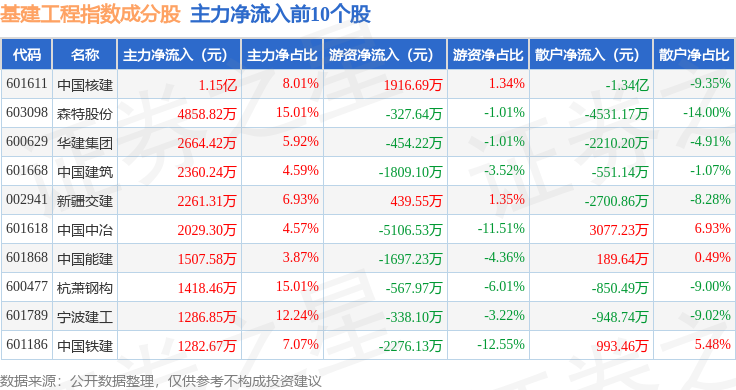 资金流向方面,基建工程(399995)指数成份股当日主力资金净流出合计12.17亿元,游资资金净流入合计7344.96万元,散户资金净流入合计11.44亿元。成份股资金流向详情见下表: